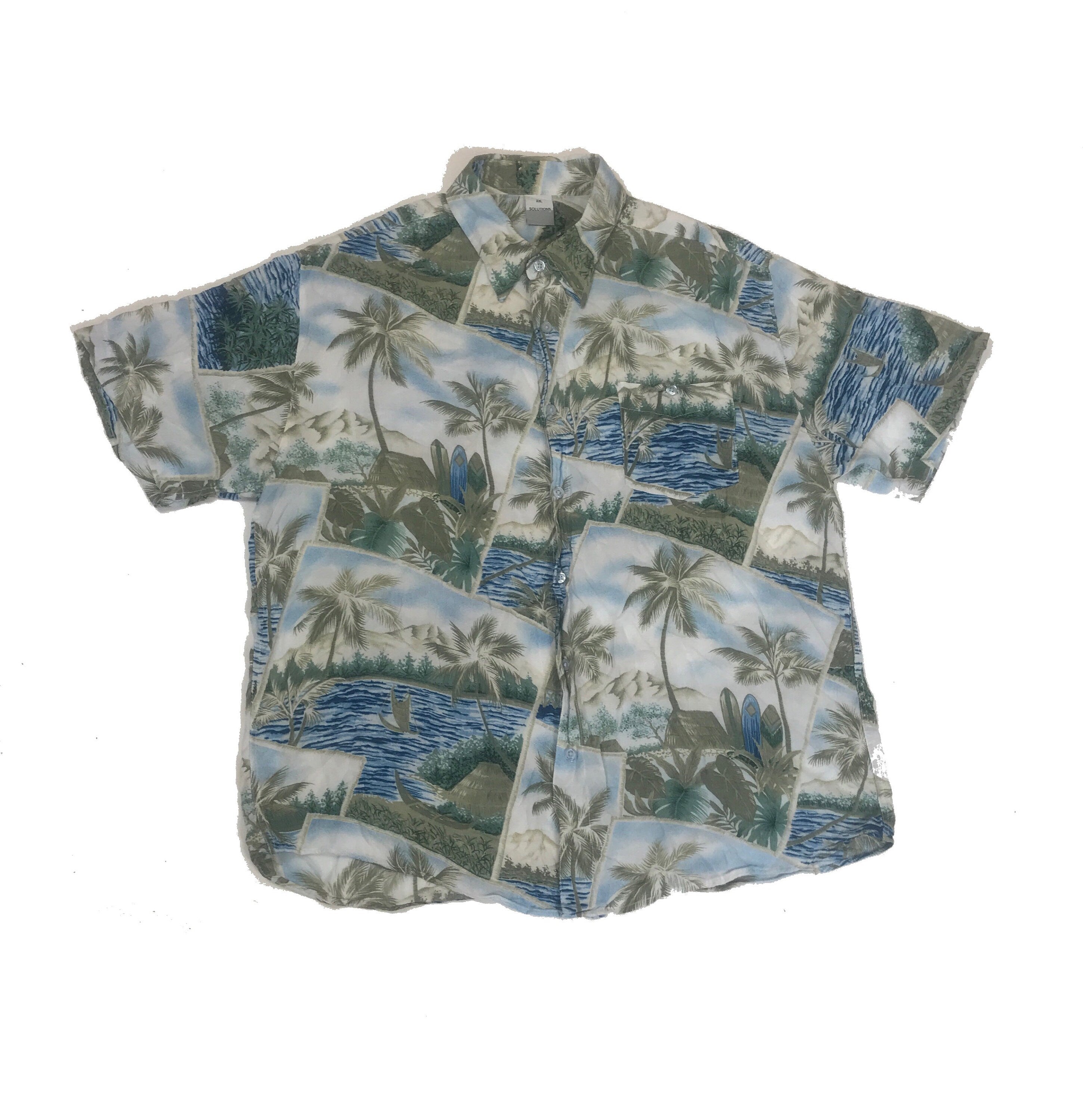 Vintage Y2K mens light green pale blue hibiscus palm trees print Hawaiian eccentric statement quirky party festival shirt size XL