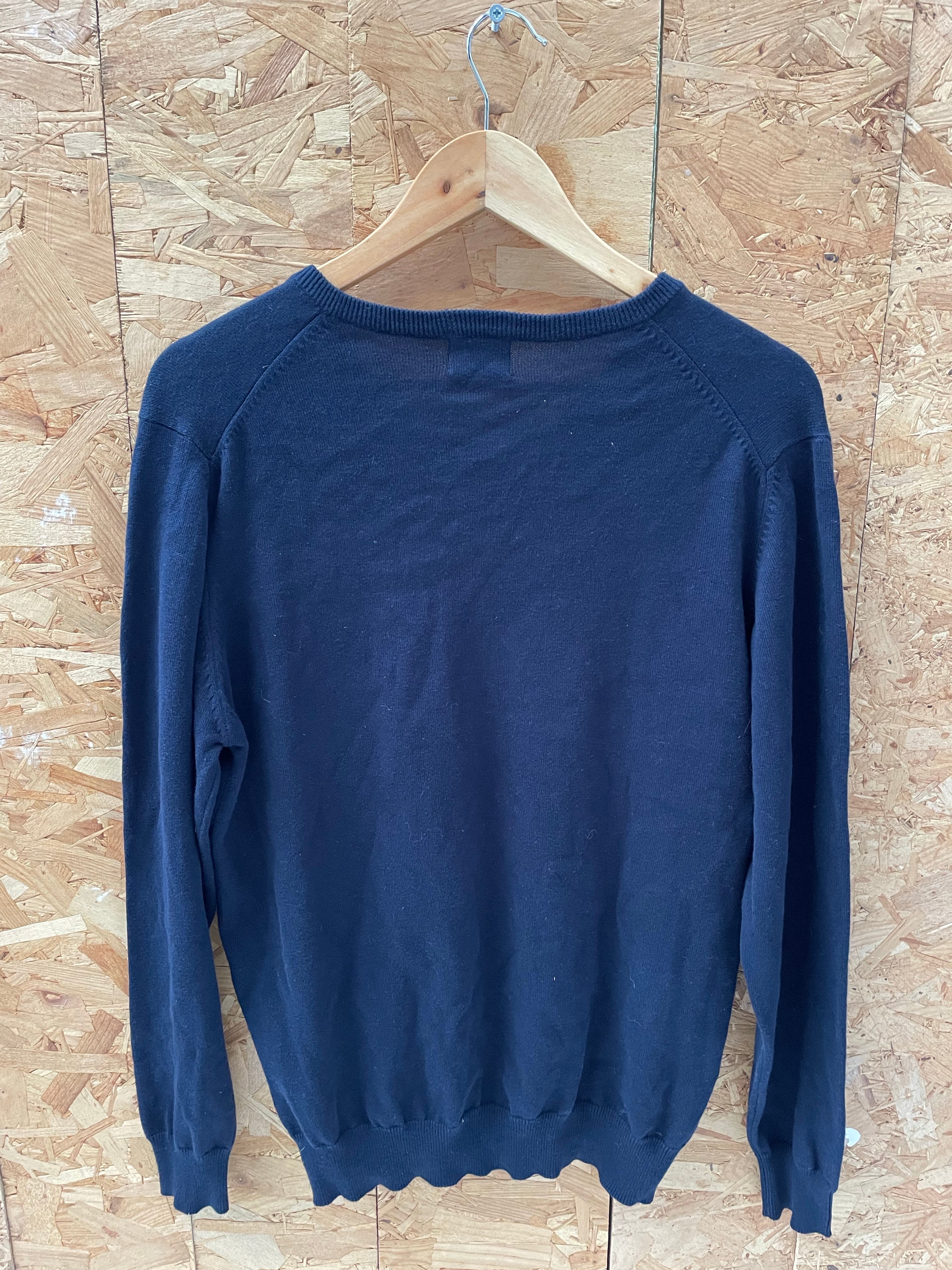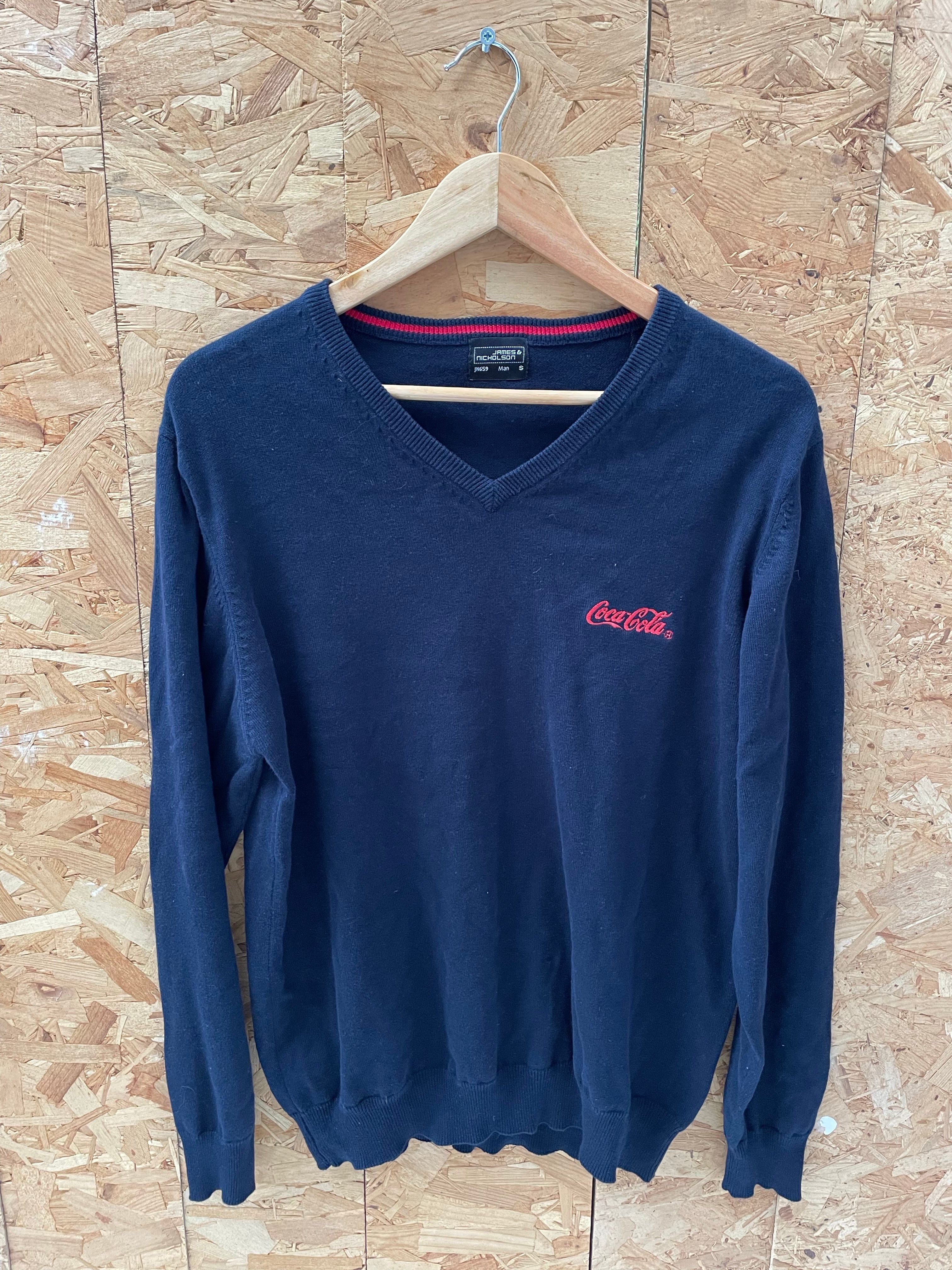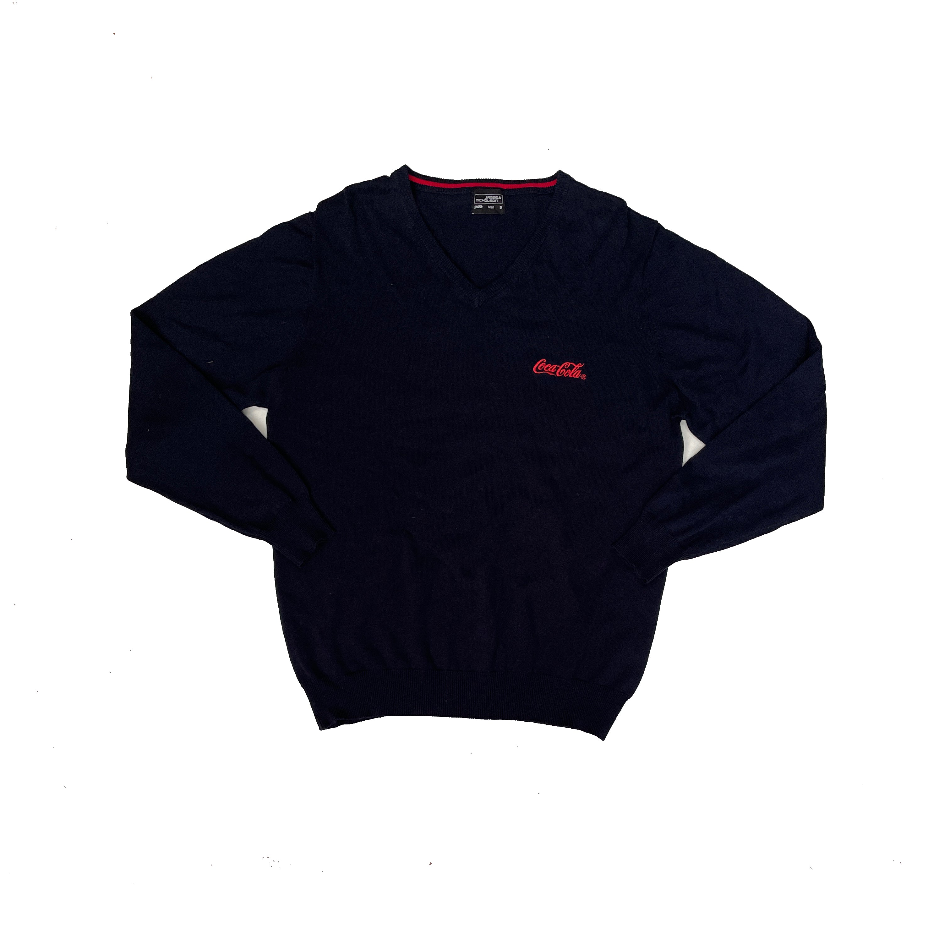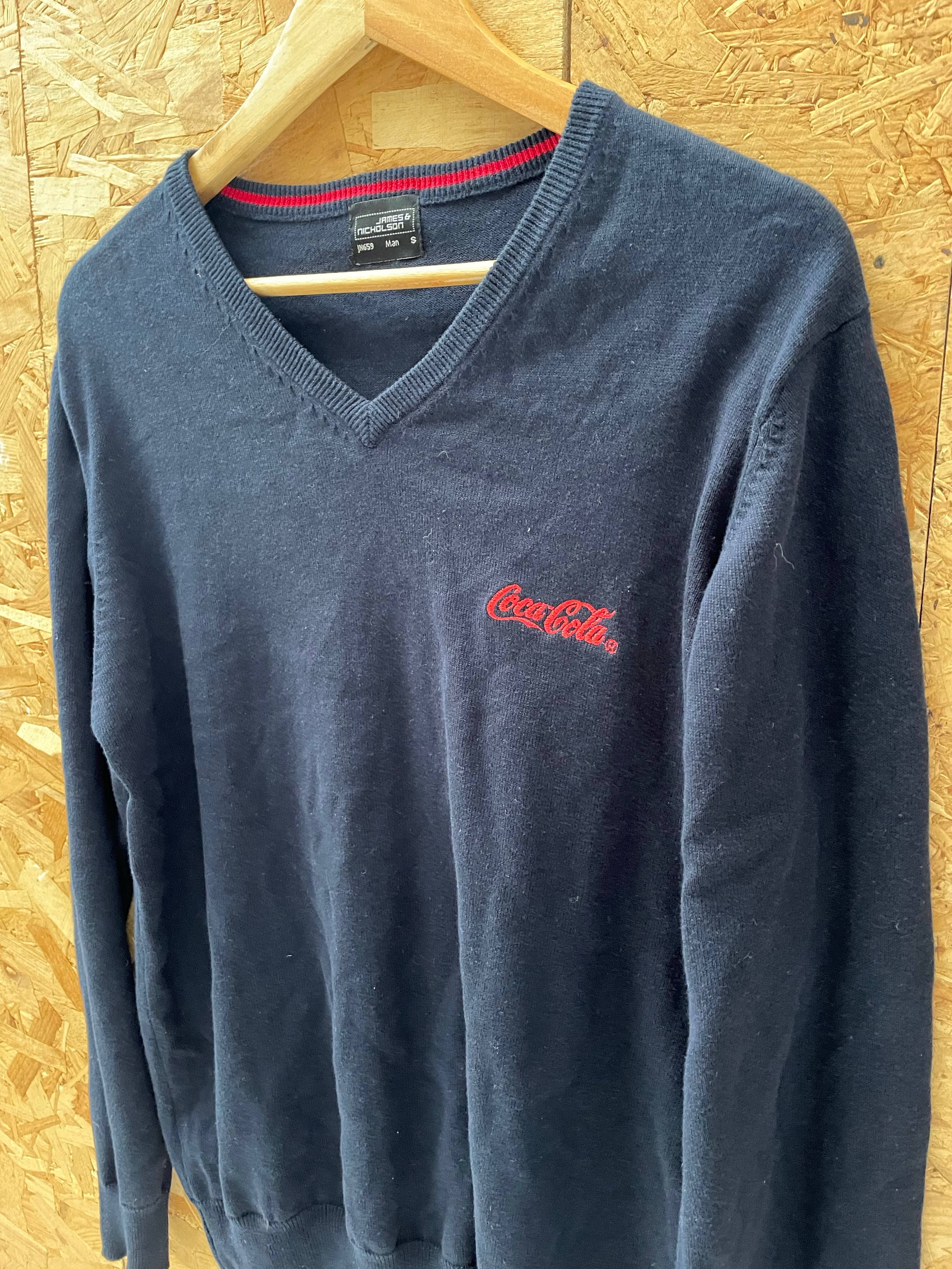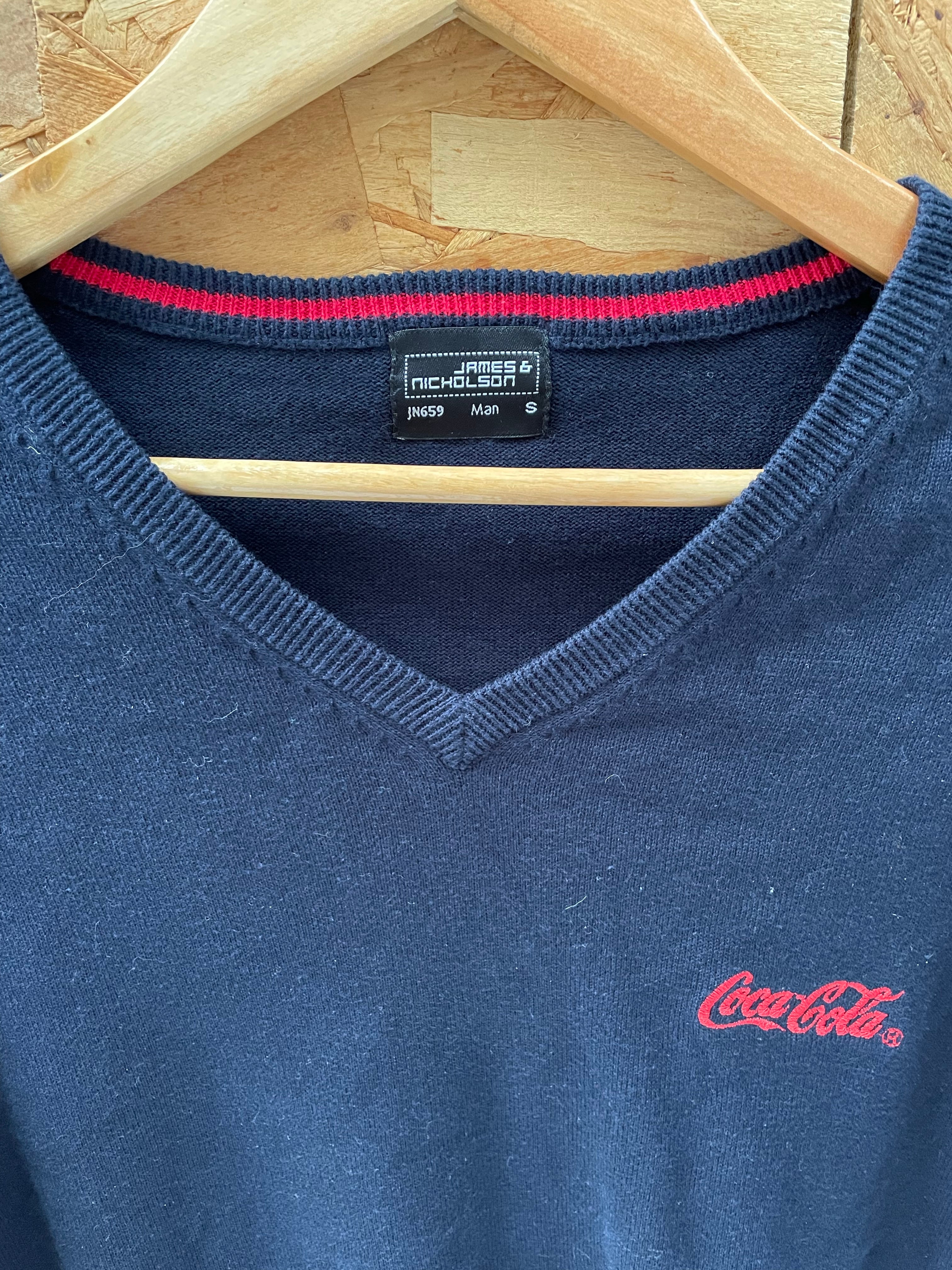 Men's size small navy red Coca-Cola V-neck sweater by James Nicholson. Features a small embroidered Coca-Cola logo. Good pre-owned condition. Color: Dark Blue.