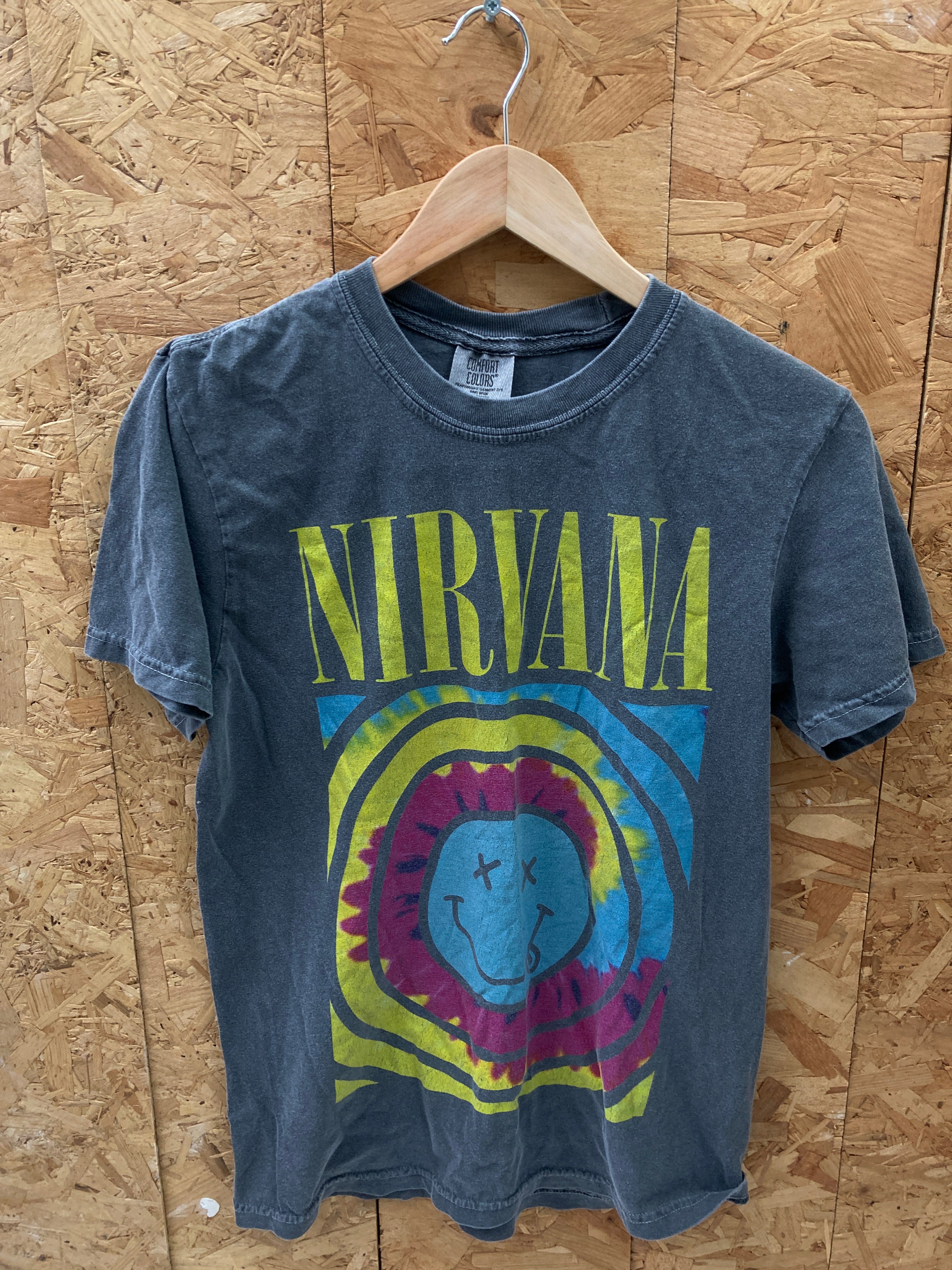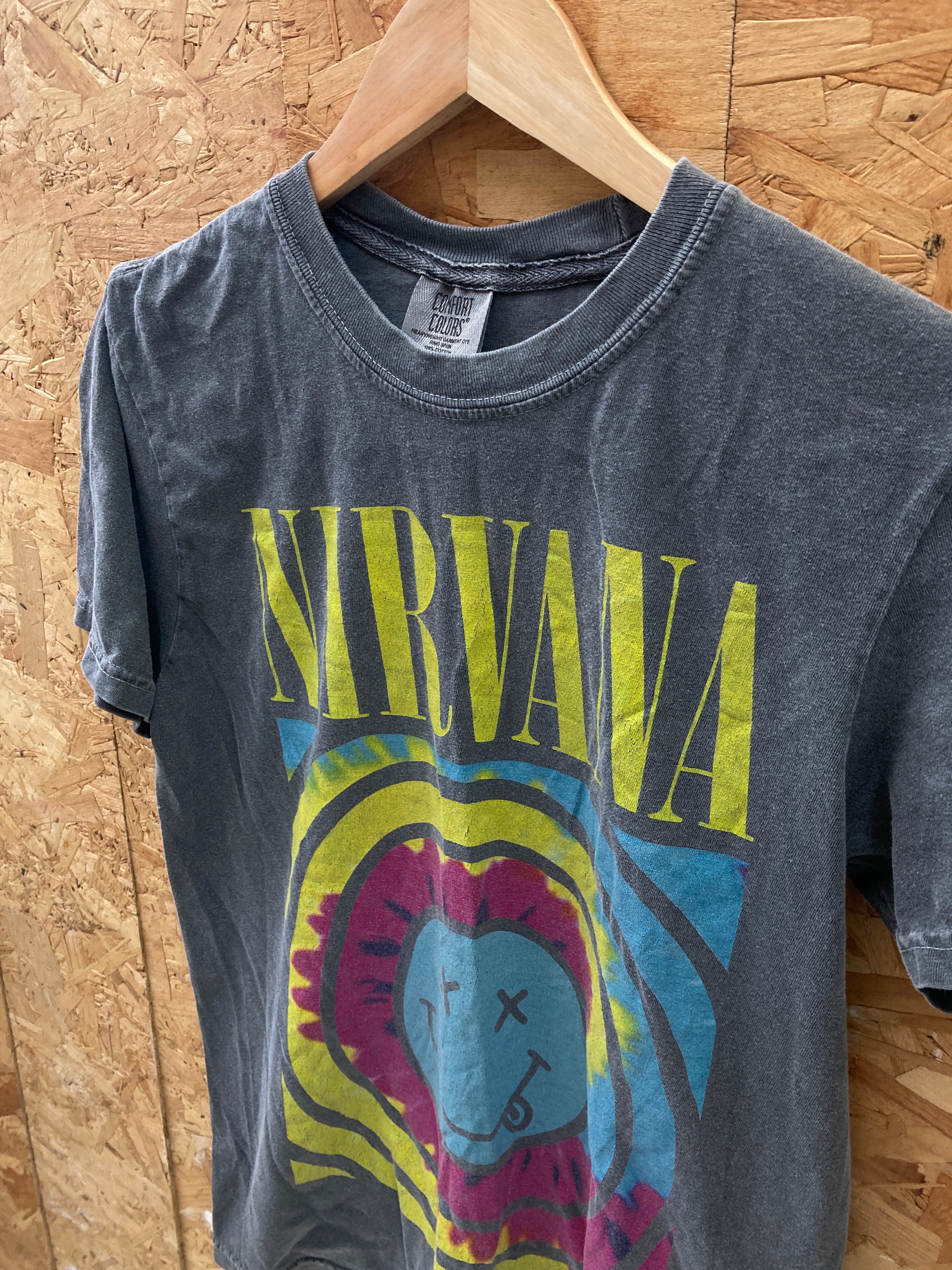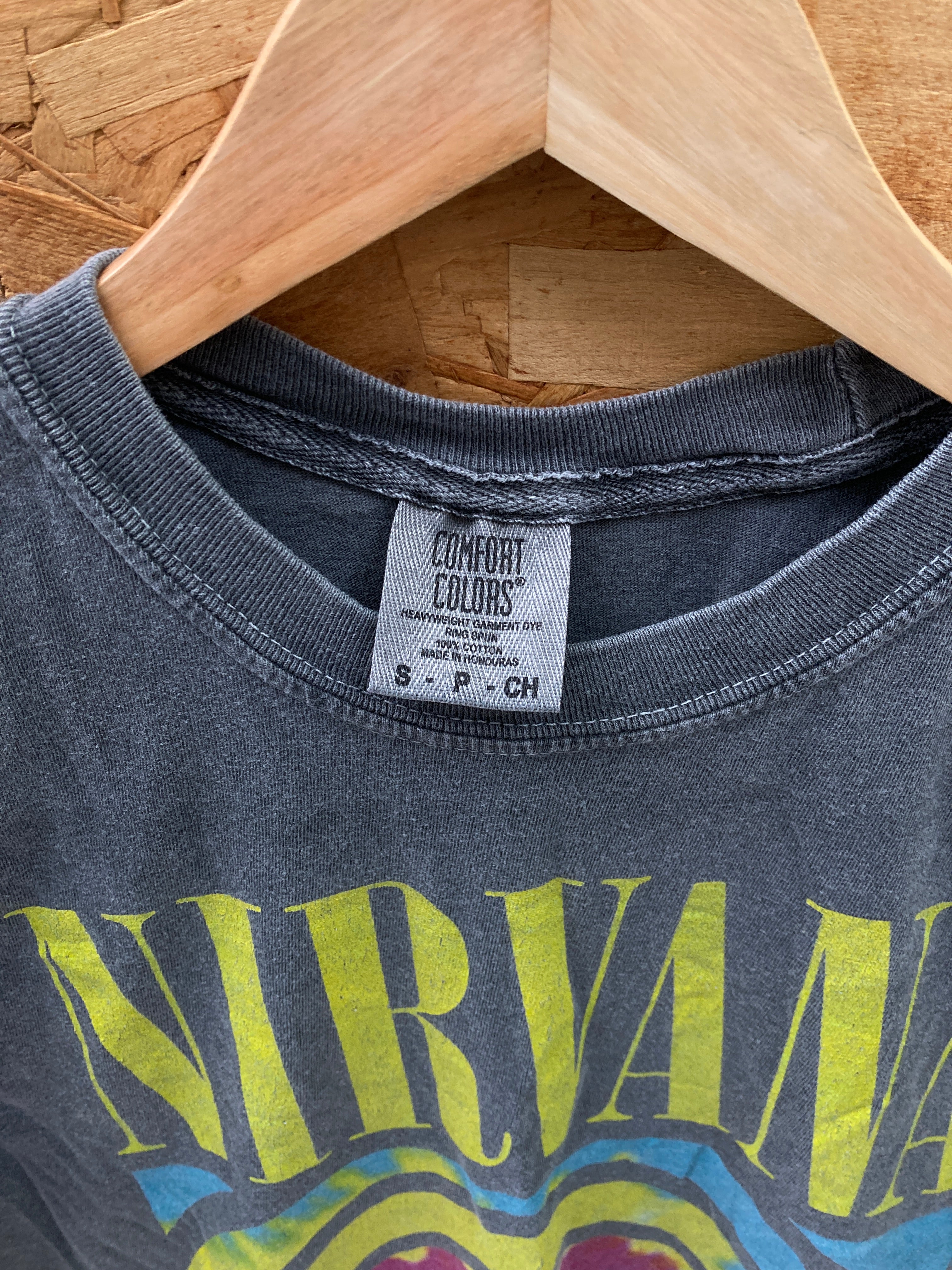 Vintage Y2K Nirvana smiley face grey faded grungy t-shirt size small