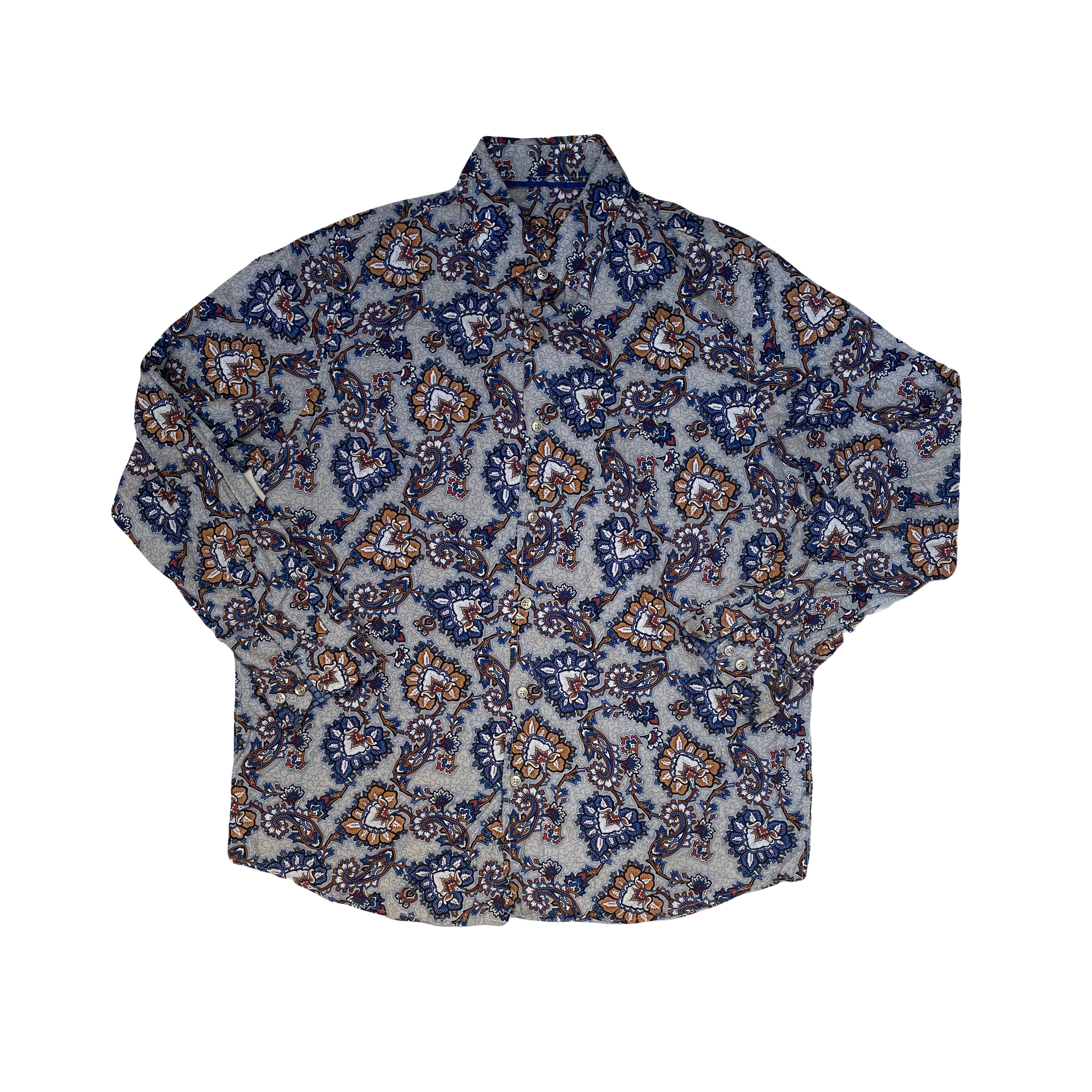 Men's vintage long sleeve button up shirt. Features a beautiful paisley print in shades of blue, brown, and beige on a gray background. Excellent pre-owned condition. Color: Multicolor.