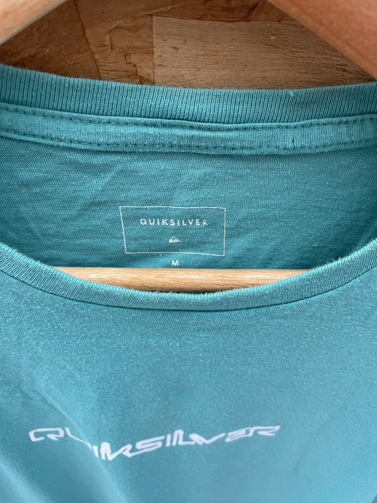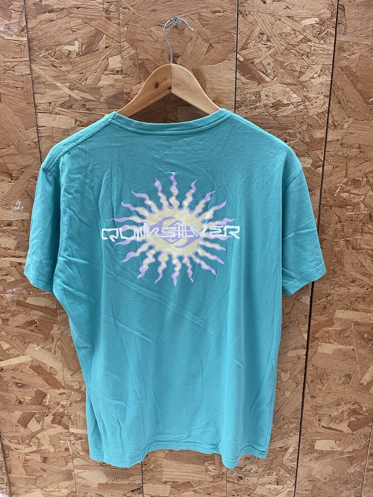 Quiksilver men's graphic t-shirt in a size medium. This modern tee features a teal color with a cool graphic design on the front and back. Made from comfortable fabric, perfect for casual wear. In excellent condition.