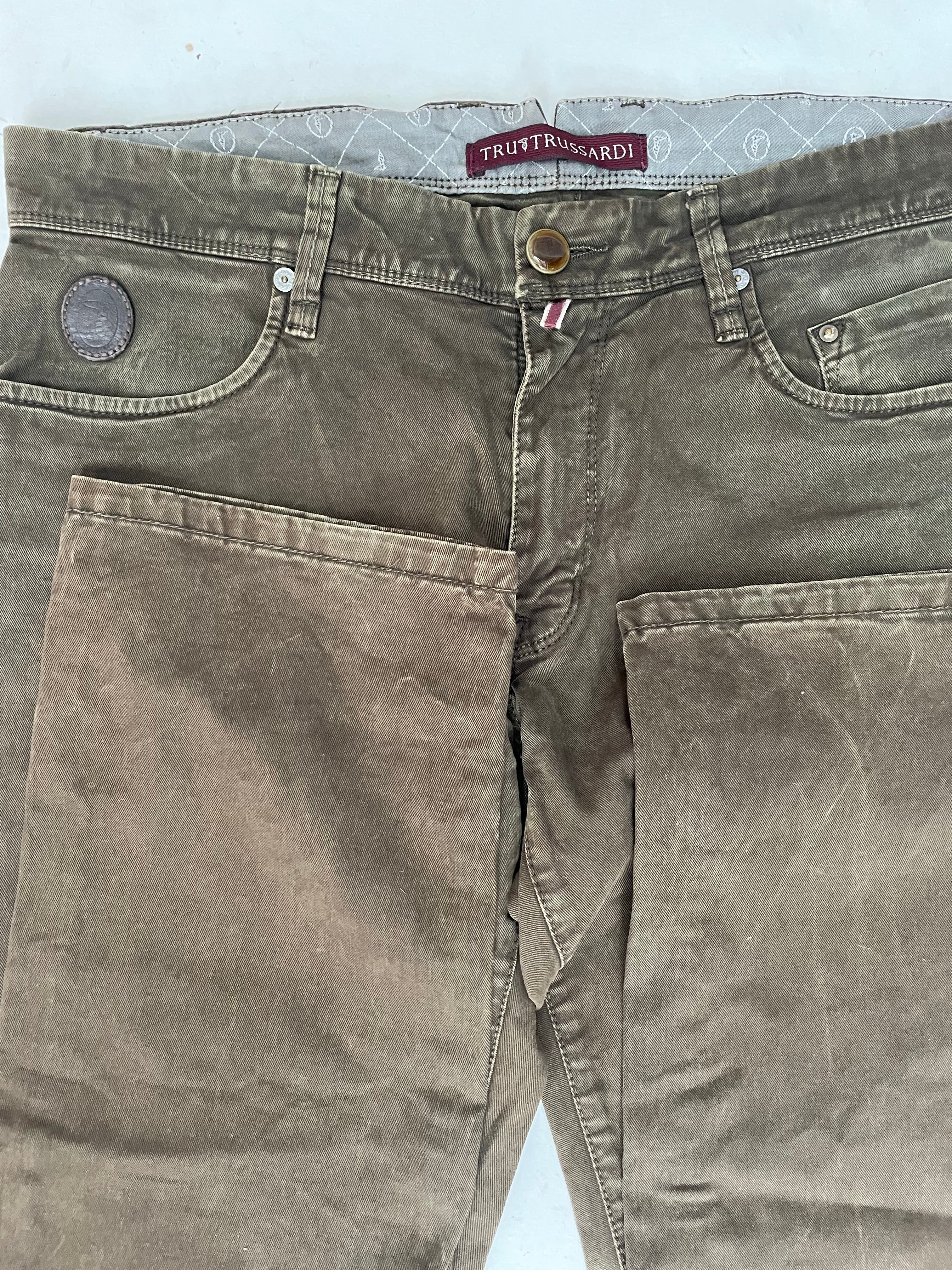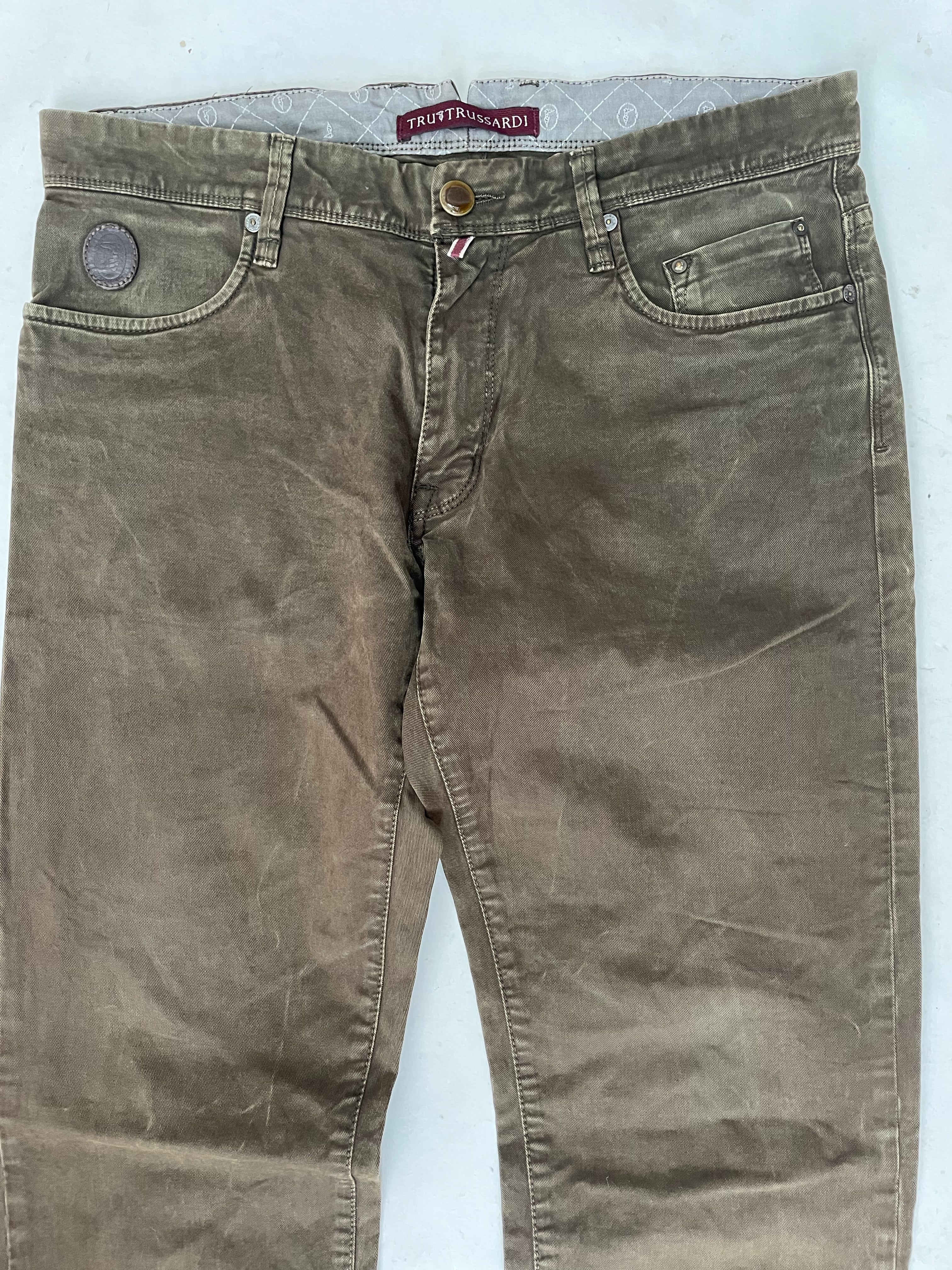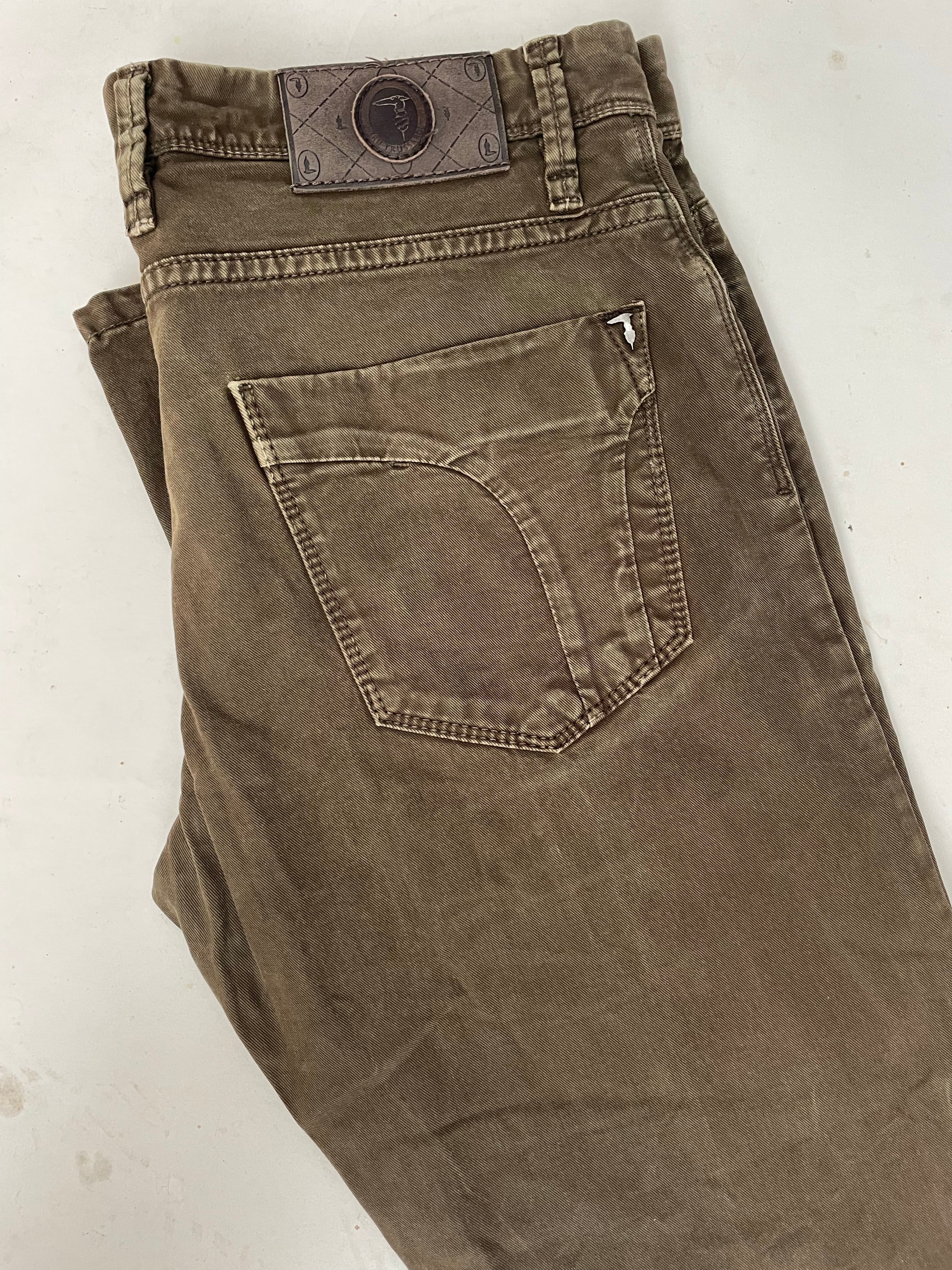 Men's Trussardi olive green straight leg jeans. Size 34x34 Good condition. Classic style. Made in Italy. Color: Brown.