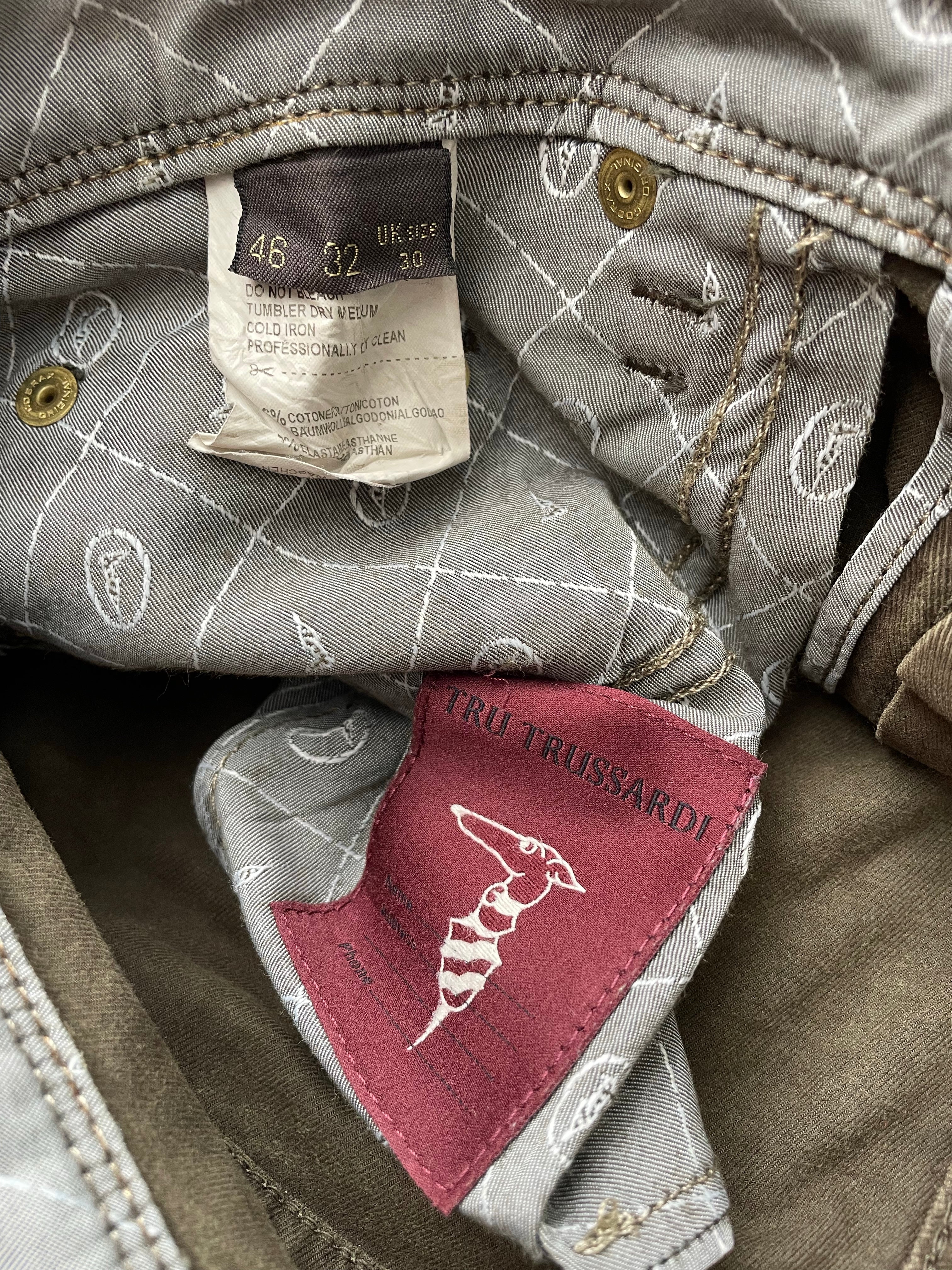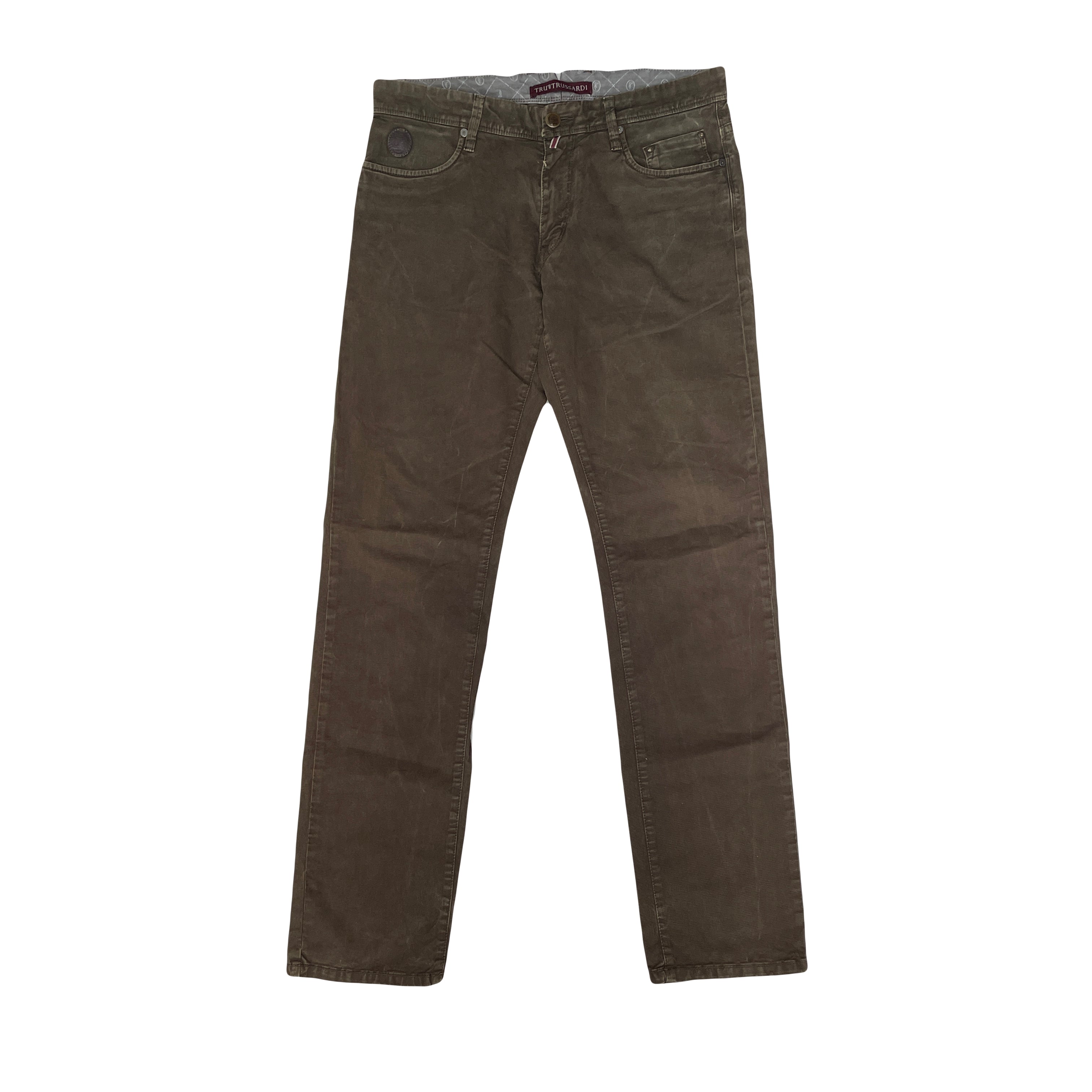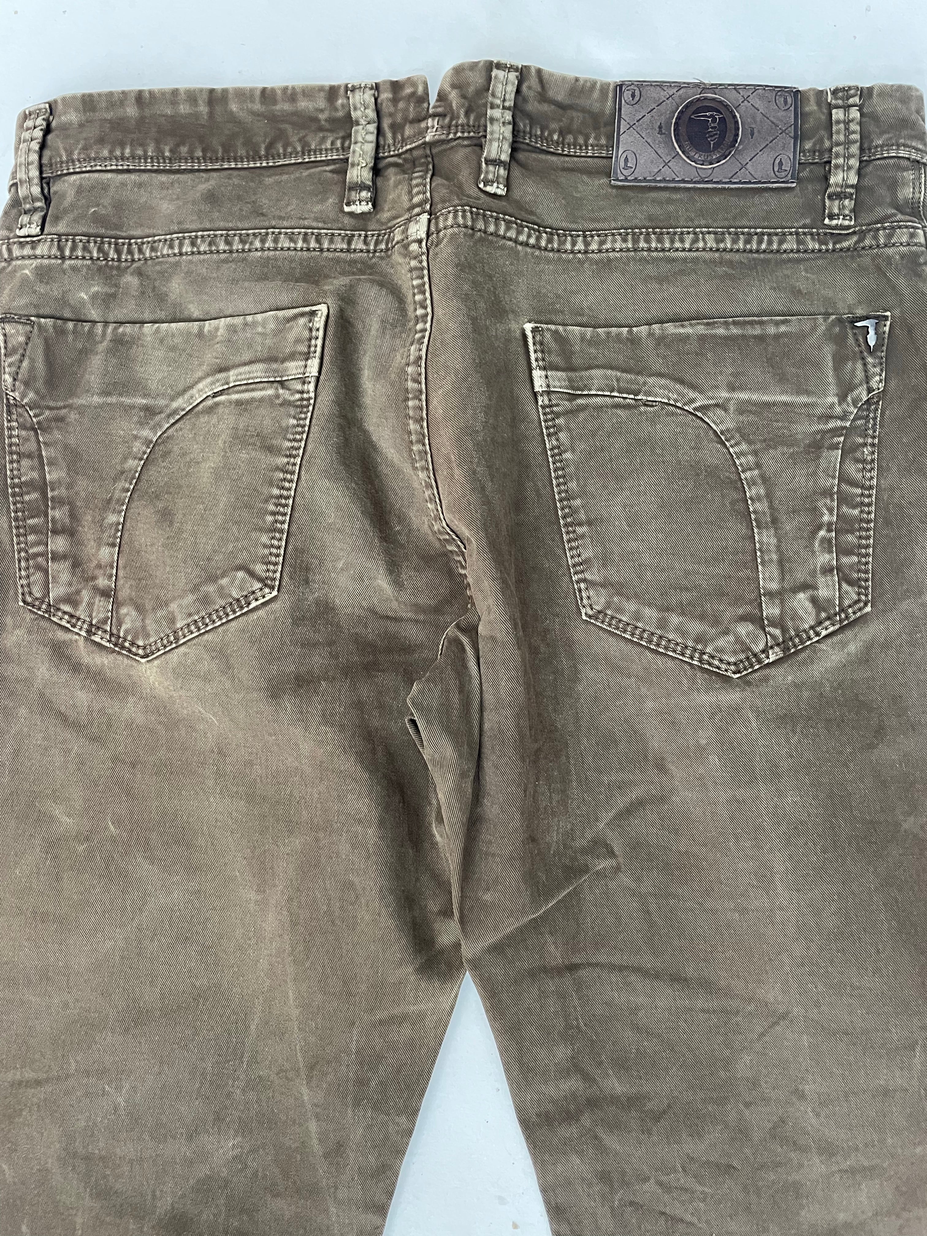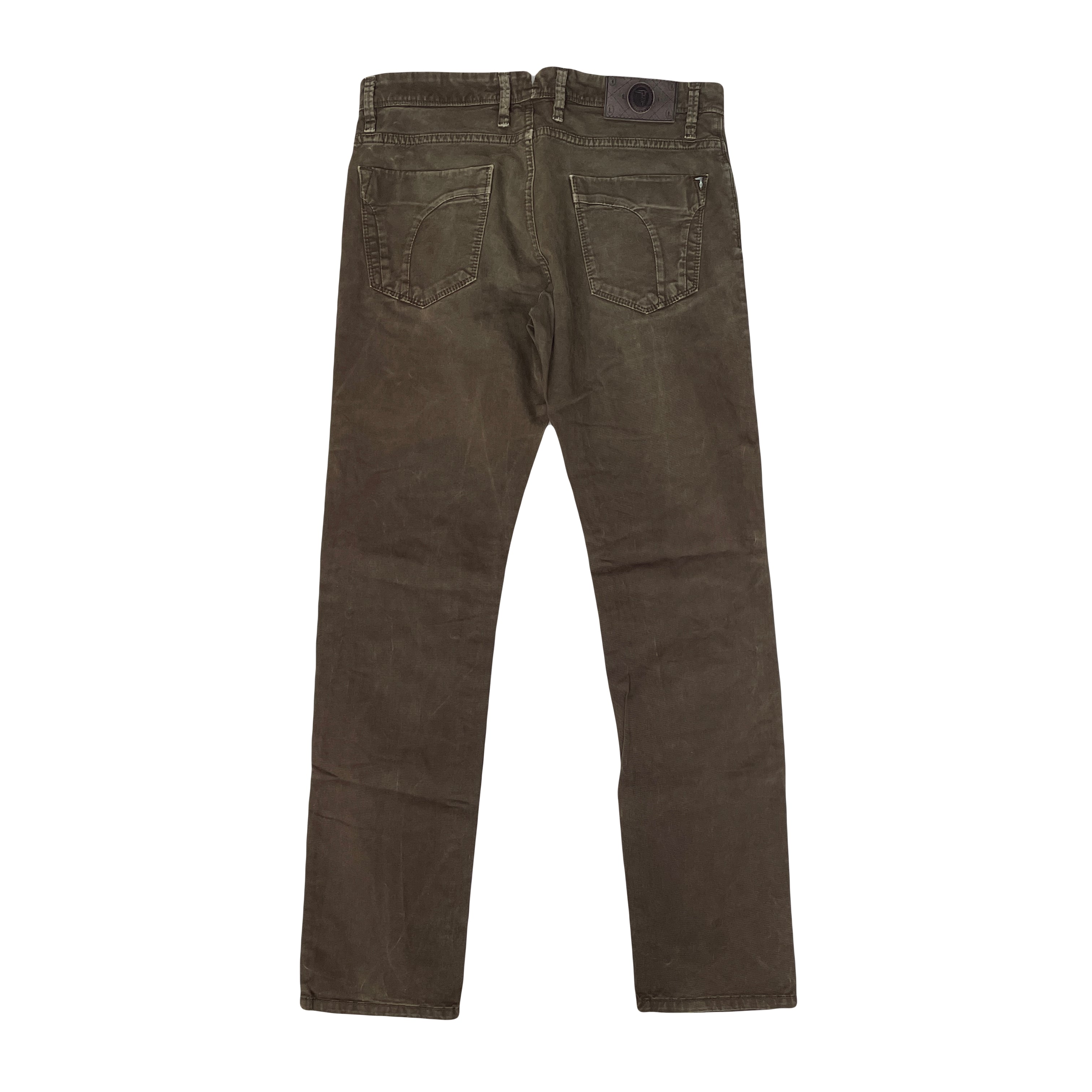 Men's Trussardi olive green straight leg jeans. Size 34x34 Good condition. Classic style. Made in Italy. Color: Brown.