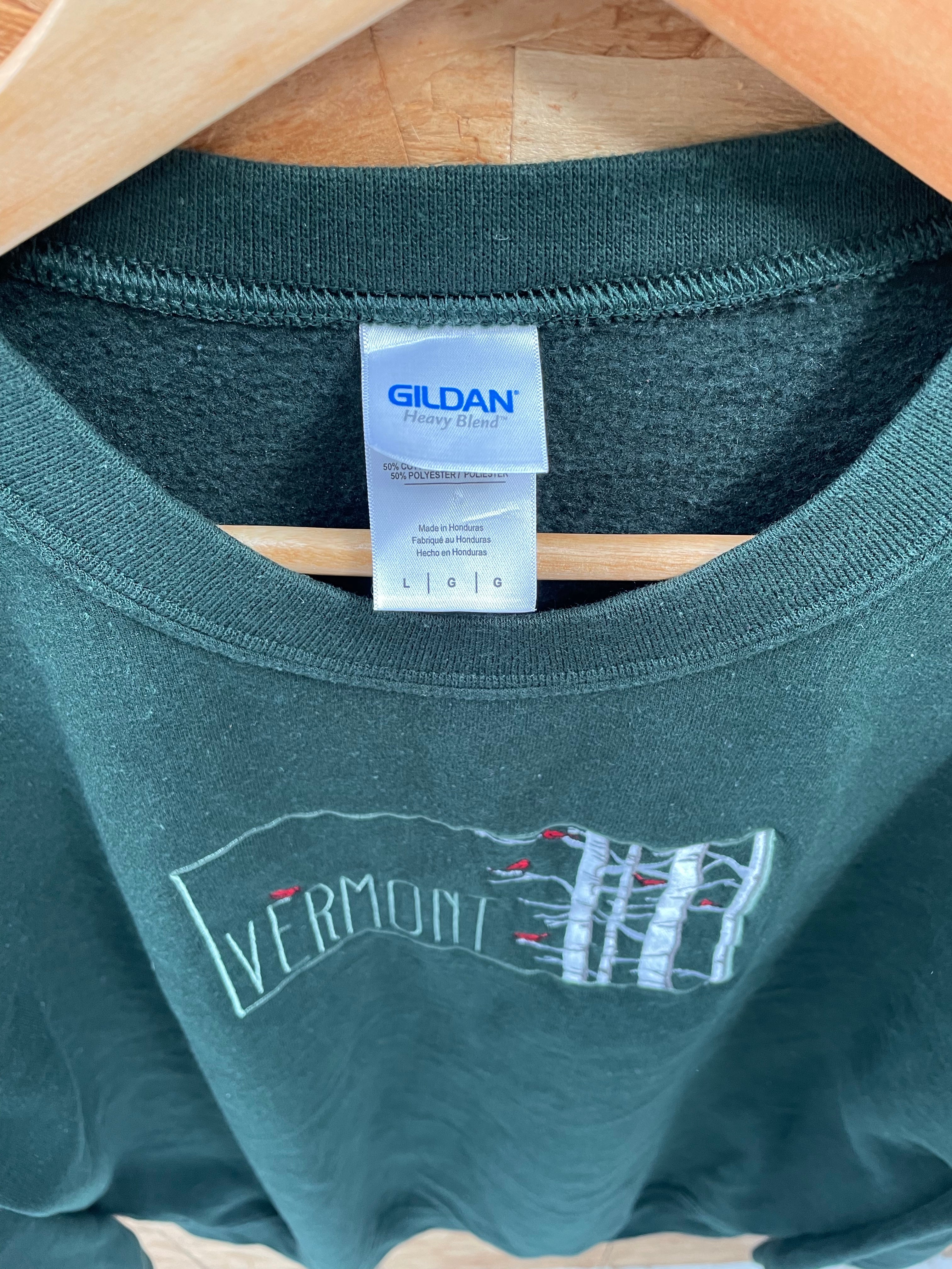 Gildan brand dark green crewneck sweatshirt with embroidered Vermont design. Features a nature scene with trees and birds. Size L. Color: Dark Green.